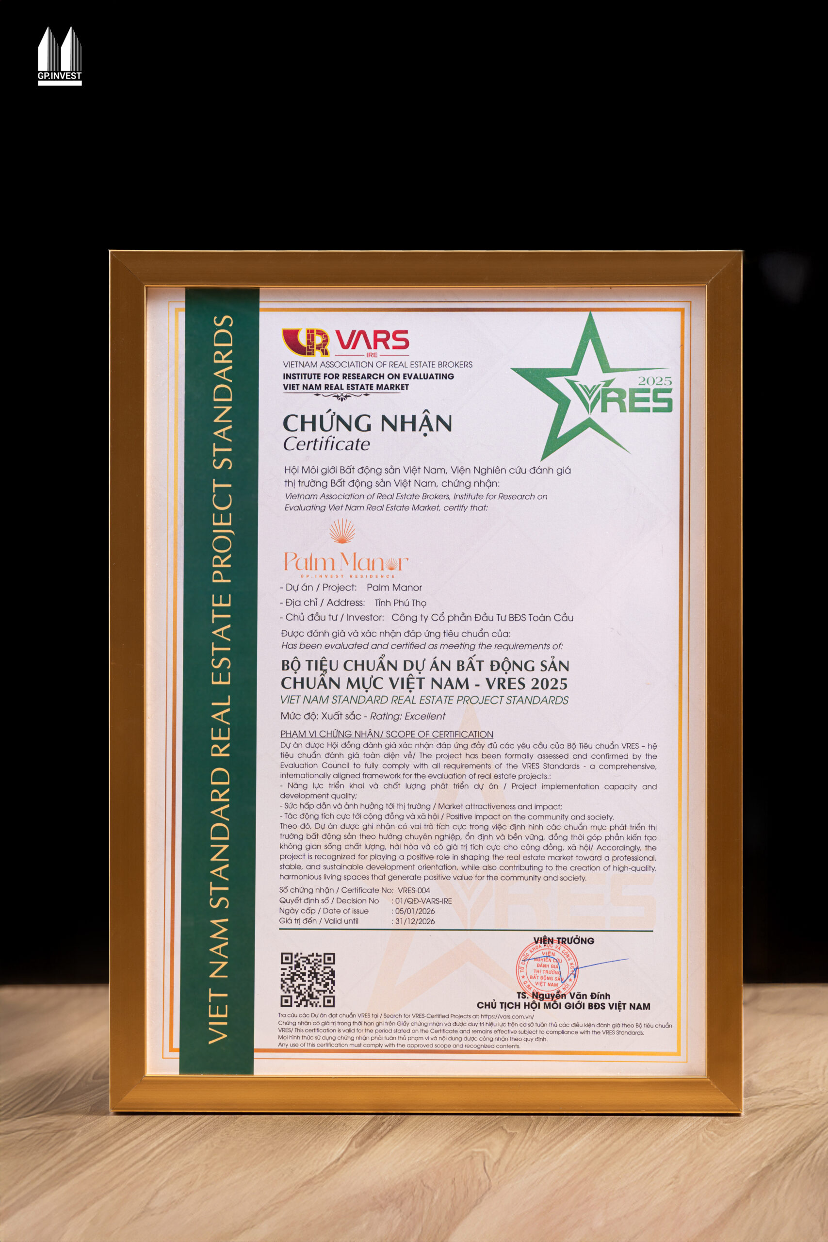 Việc Palm Manor xuất sắc vượt qua các tiêu chí nghiêm ngặt của VRES để được công nhận là “Dự án bất động sản đạt chuẩn VRES Việt Nam 2026” là minh chứng rõ nét cho định hướng phát triển bền vững mà GP.Invest theo đuổi ngay từ những ngày đầu triển khai dự án.
